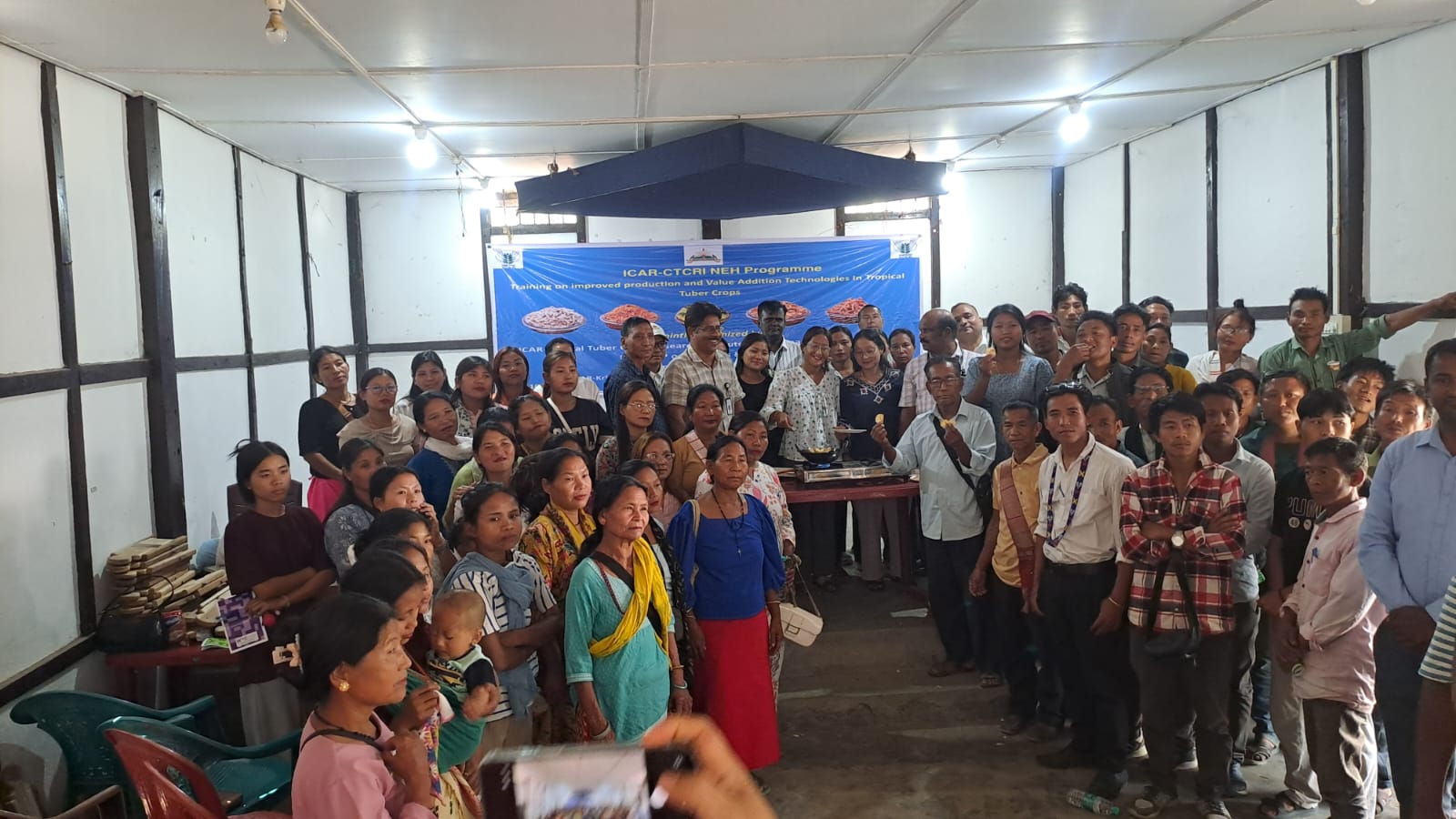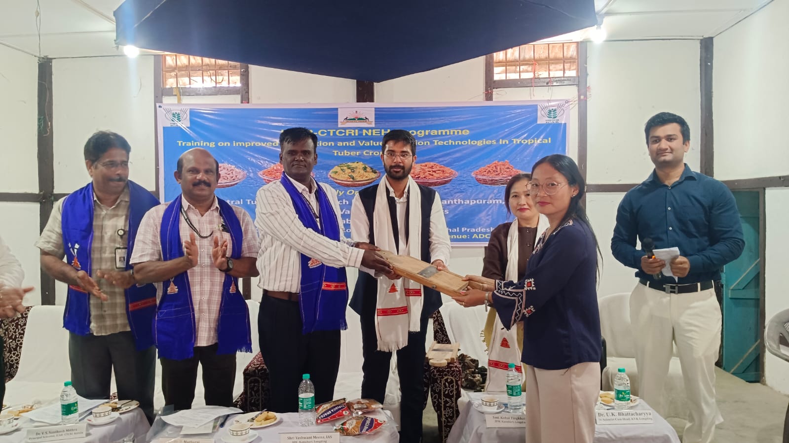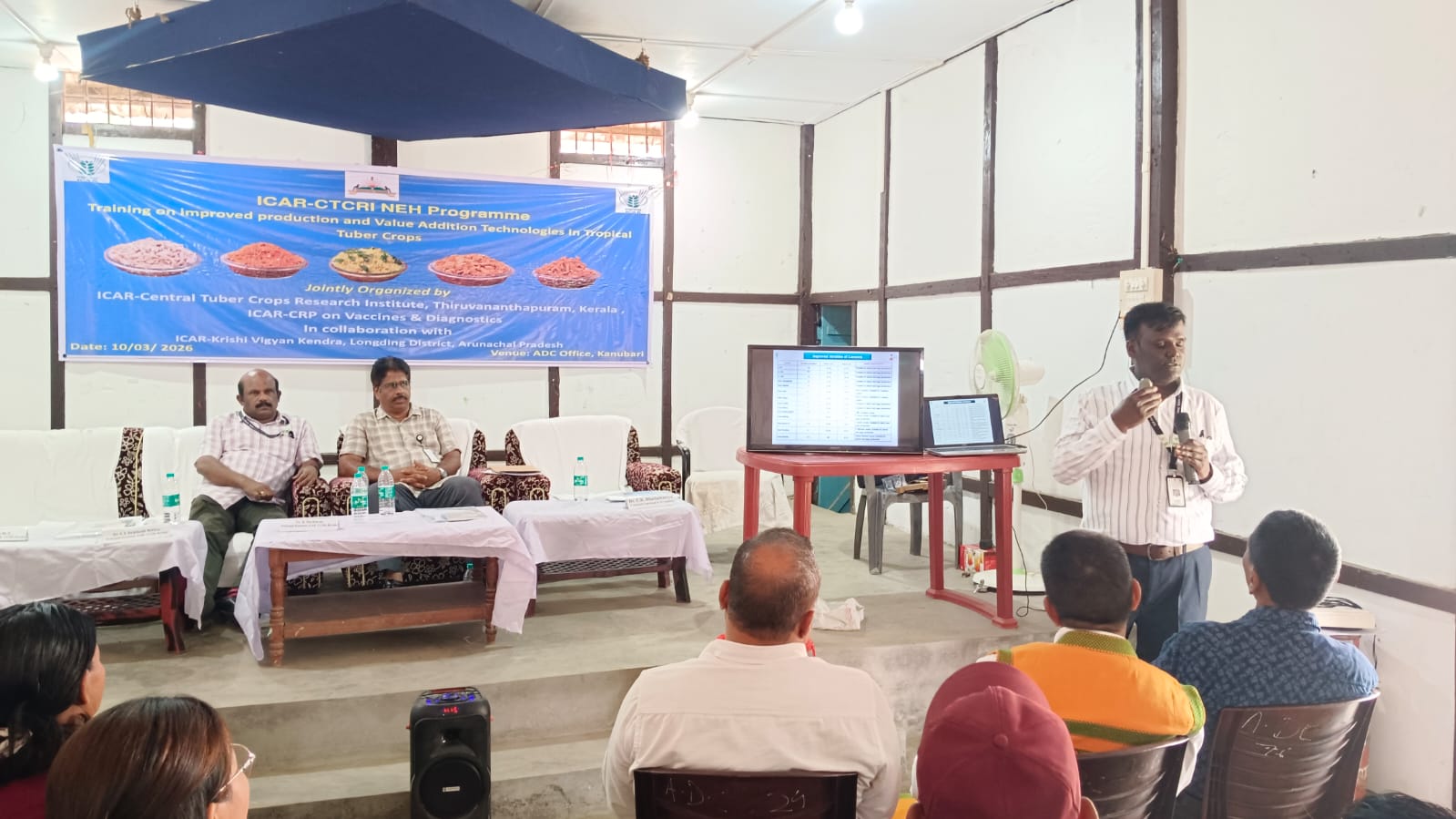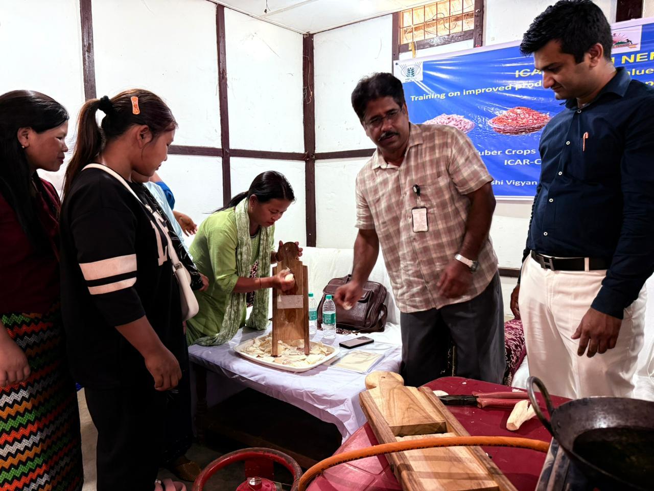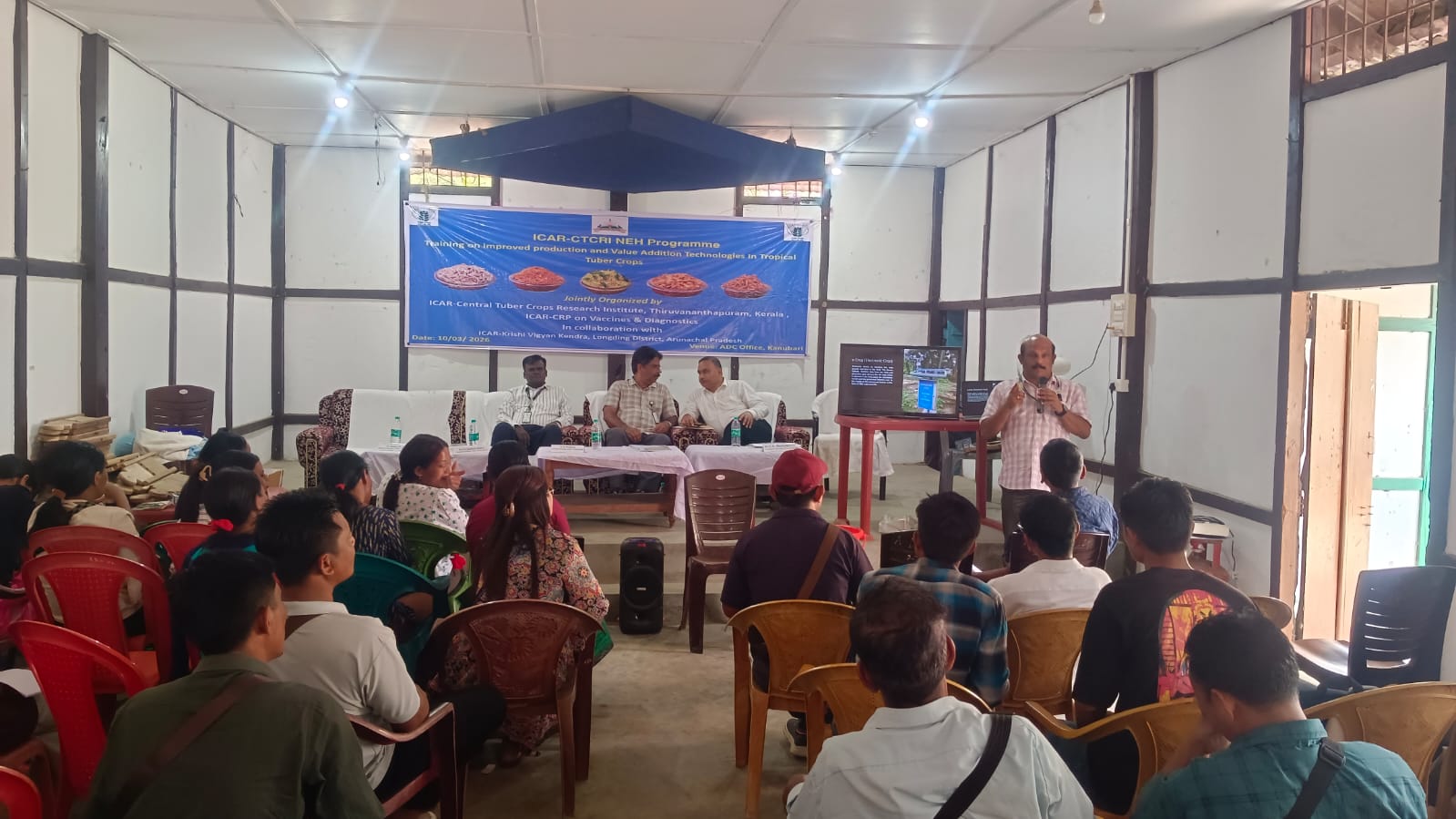 A Training-cum-Demonstration Programme on “Improved Production and Value Addition Technologies in Tropical Tuber Crops” was organized under ICAR-CTCRI NEH Programme 2026 in collaboration with ICAR-Krishi Vigyan Kendra Longding on 10 March 2026 at Kanubari, Longding district, Arunachal Pradesh. The programme was graced by Shri Yashwant Meena, IAS, Additional Deputy Commissioner, Kanubari as the Chief Guest and he stressed the importance of scientific cultivation of high yielding varieties and value addition for augmenting farmers income. Smt. Kohai Tingkhatra, ZPM of Kanubari was the Guest of Honour. Dr. U. K. Bhattacharyya, Senior Scientist-cum-Head, ICAR-KVK Longding delivered the welcome address and highlighted the importance of tropical tuber crops in improving food and nutritional security in the North-Eastern Hill region. During the technical session, Dr. R. Muthuraj, Principal Scientist and Project PI of the NEH Programme delivered a lecture on improved production technologies in tropical tuber crops, explaining scientific cultivation practices for enhancing productivity. Dr. Sajeev M. S., in his class on value addition and entrepreneurship development in tuber crops highlighted opportunities for processing tuber crops into products such as chips, flour, starch, and traditional snack items to enhance farmers’ income. As part of the programme, farmers were also provided hands-on training on preparation of chips and namkeen from cassava. A special lecture on AI and IoT in tuber crops was delivered by Dr. V. S. Santhosh Mithra who explained the role of digital technologies for improving farm management and productivity. During the programme, farm tools like hand hoes, spades, tuber slicers and Trichoderma bio capsules were distributed to the farmers to promote cultivation and post-harvest processing and value addition. About 100 farmers from various parts of the district participated in the training programme. The programme was organized with the active involvement of ICAR-KVK Longding staff including Shri Vikas (SMS, Horticulture), Dr. Tilling Tayo (ACTO, Animal Science), Dr. Amit Kumar (SMS, Land & Water Management Engineering), and Dr. Deep Narayan Mishra (SMS, Plant Pathology).