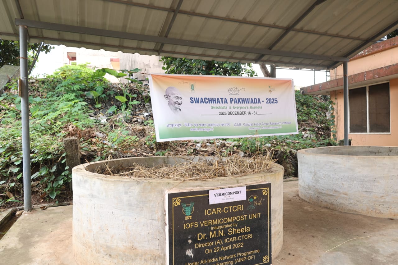 As part of these practices, a vermicomposting unit integrated with a cattle shed has been established, where earthworms are cultured using cow dung and subsequently utilized for the production of vermicompost. A demonstration on vermicomposting was conducted by Dr. G. Suja, Head, Division of Crop Production, in the presence of the Director, ICAR-CTCRI, scientists, office staff, and 25 farmers from Maharashtra.